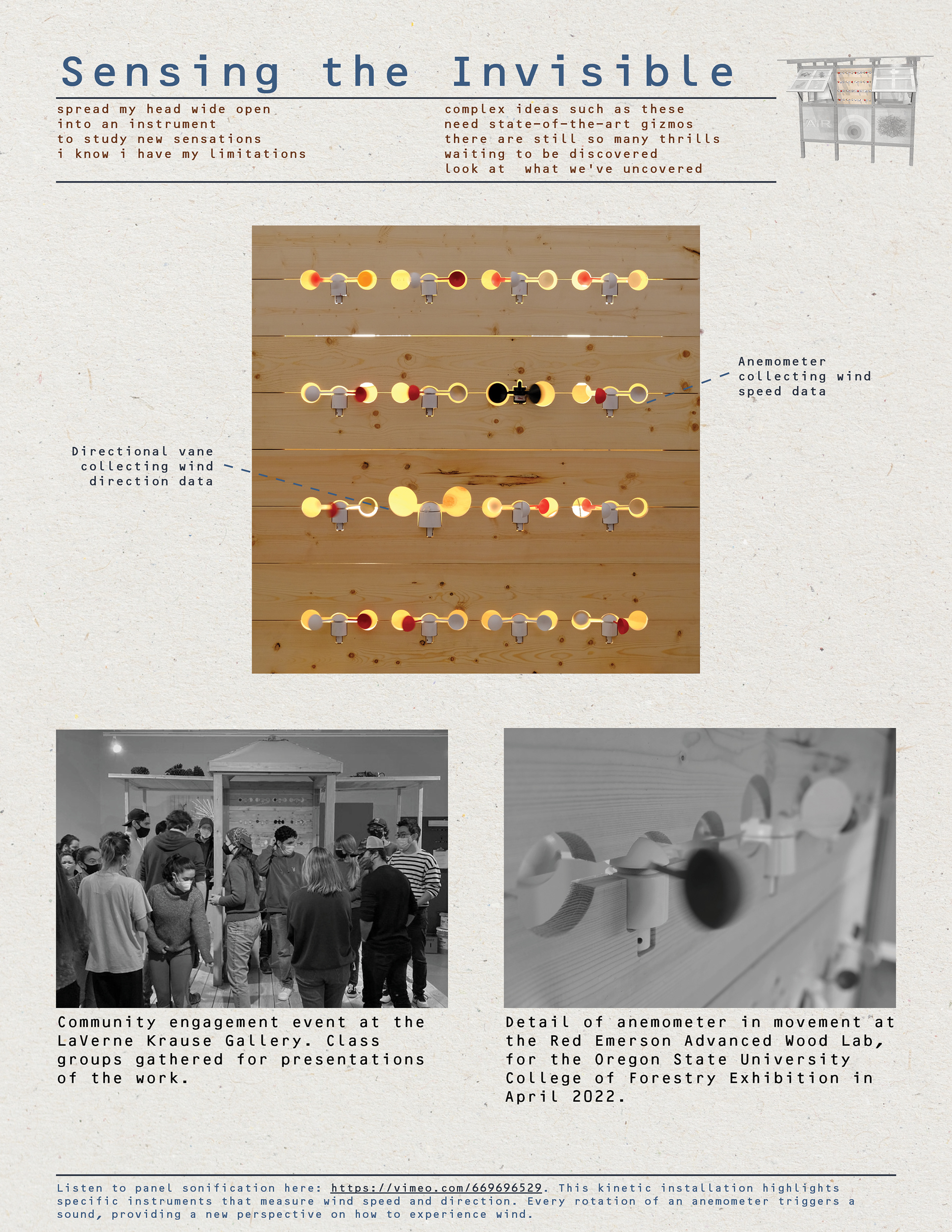 This was a maker-based project that explored narrative and form through iterative, rapid-prototyping design. The project followed a cyclical methodology, where all methods were ongoing throughout the process. This included research into a wide variety of publications on air and atmosphere. I explored critical art and technology studies through the Routledge Handbook, built landscapes in Atmospheric Anatomies, classical landscape ecology from Richard Forman, history and background of the HJA Experimental Forest, poetic narrative from David Berman’s Actual Air, and graphic communication research from Eric Sloane.