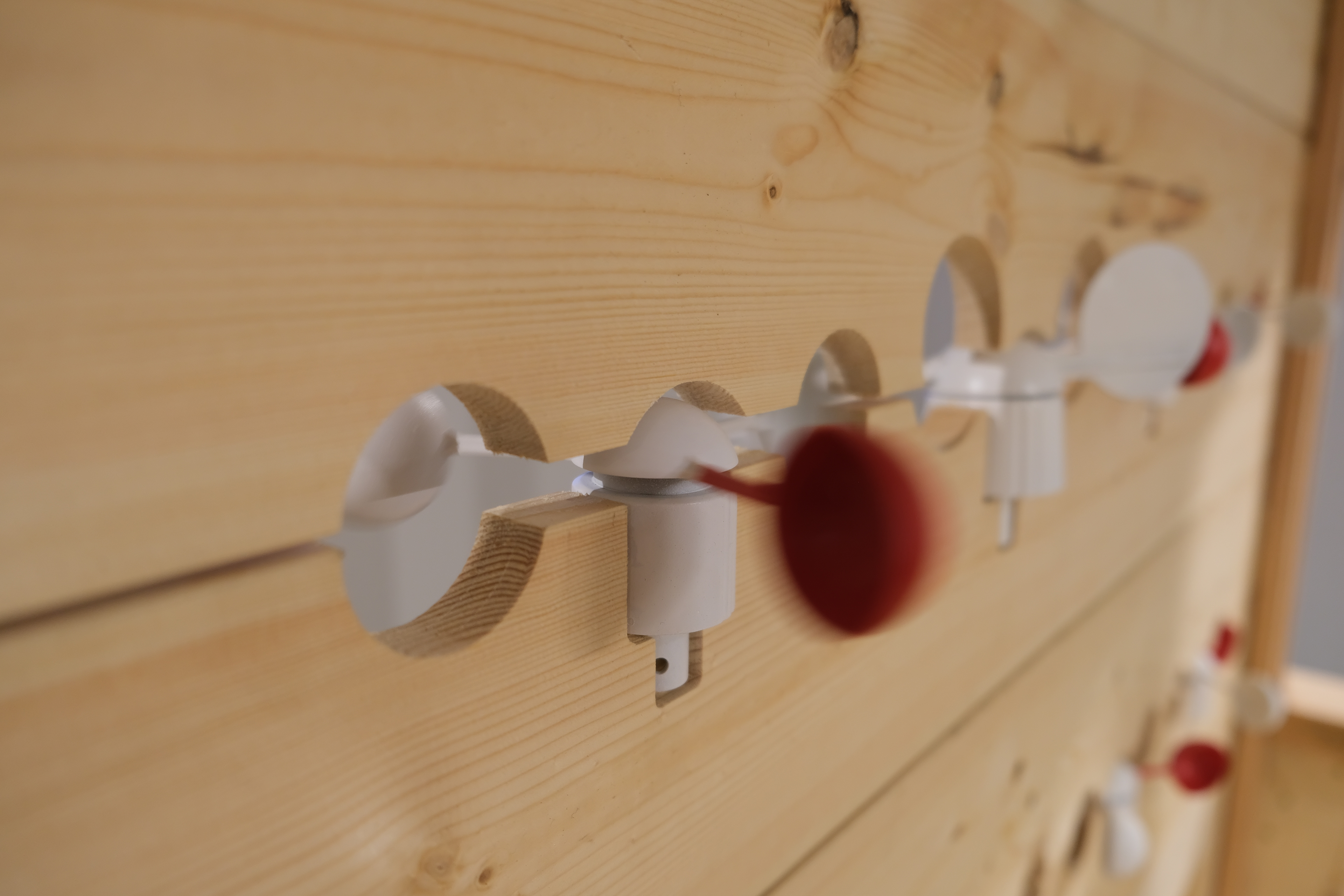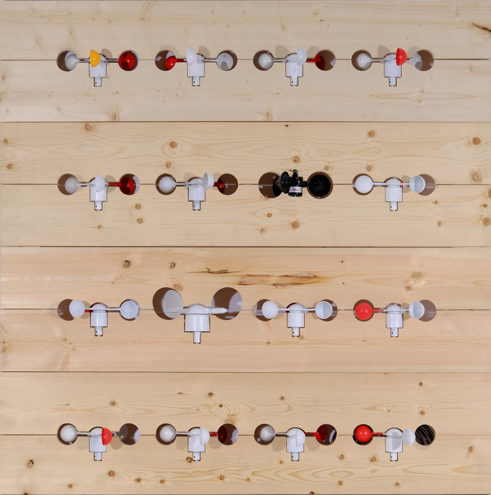 Lookout Loo, Panel 2/3, Sensing the Invisible, 44" x 44", pine, anemometers, paint, assorted hardware.