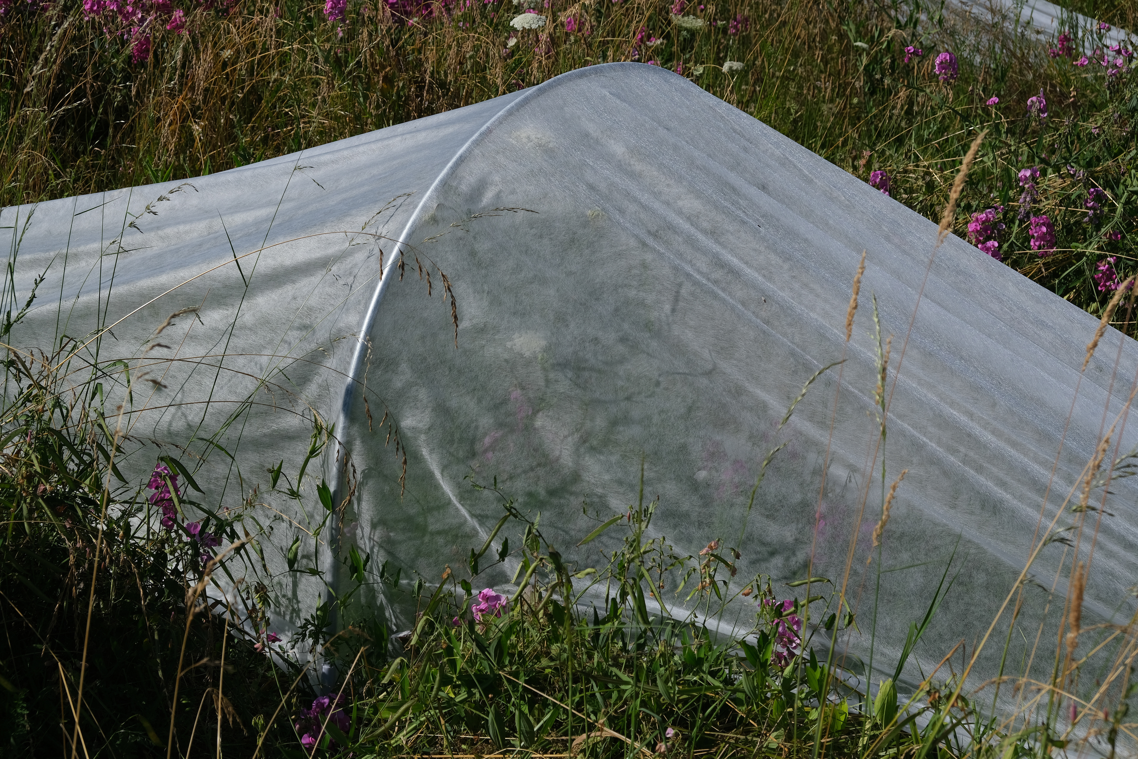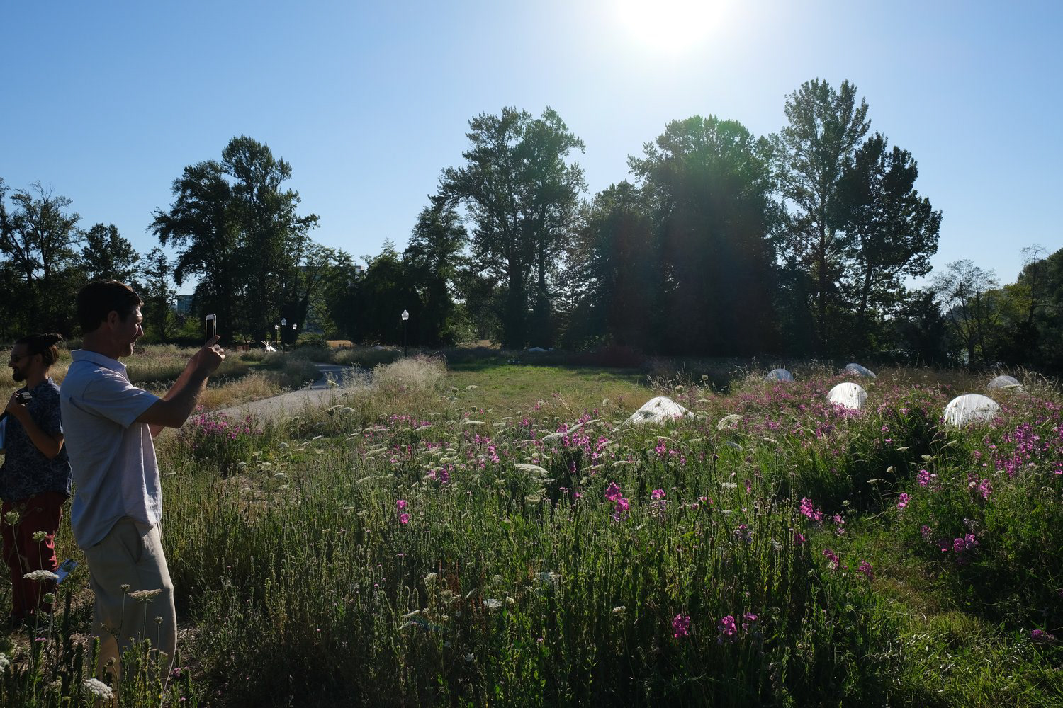 Maintenance installations made collaboratively with Abby Pierce and Masayo Simon are used as the "triggers" for the AR. These are sheets of Reemay fabric wrapped and staked around metal hoops.
